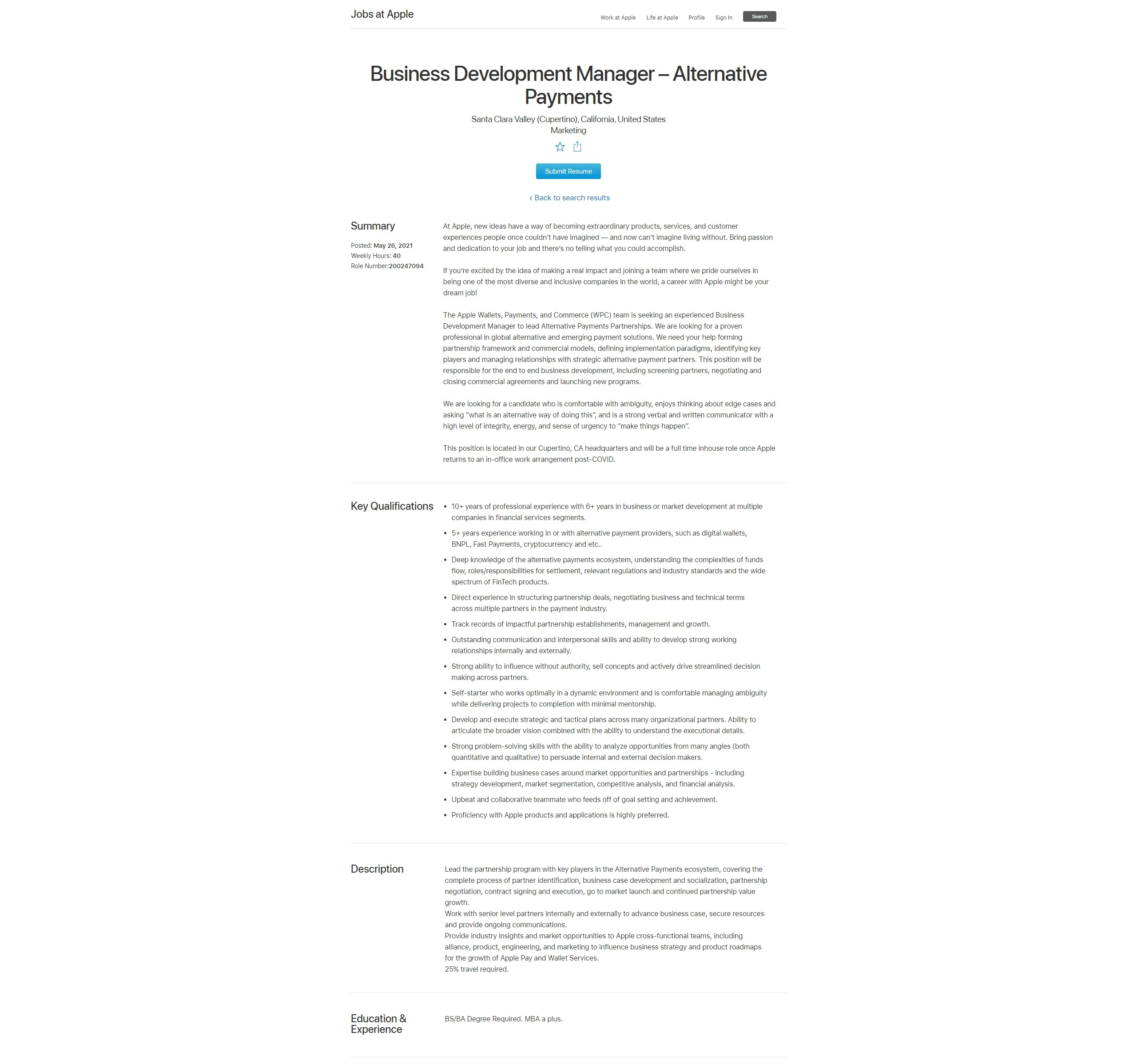 Apple은 이 직업이 필요한 주요 자격 중 하나는 금융 서비스 부문의 여러 회사에서 6년 이상 사업 또는 시장 개발 경력이 있는 10년 이상의 전문 경력과 디지털 지갑, BNPL (Buy Now, Pay Later, 선구매 후 결제) , Fast Payments, 암호화폐 등 관련 업체에서 5년 이상 근무한 경험이 있어야 한다고 밝혔습니다.