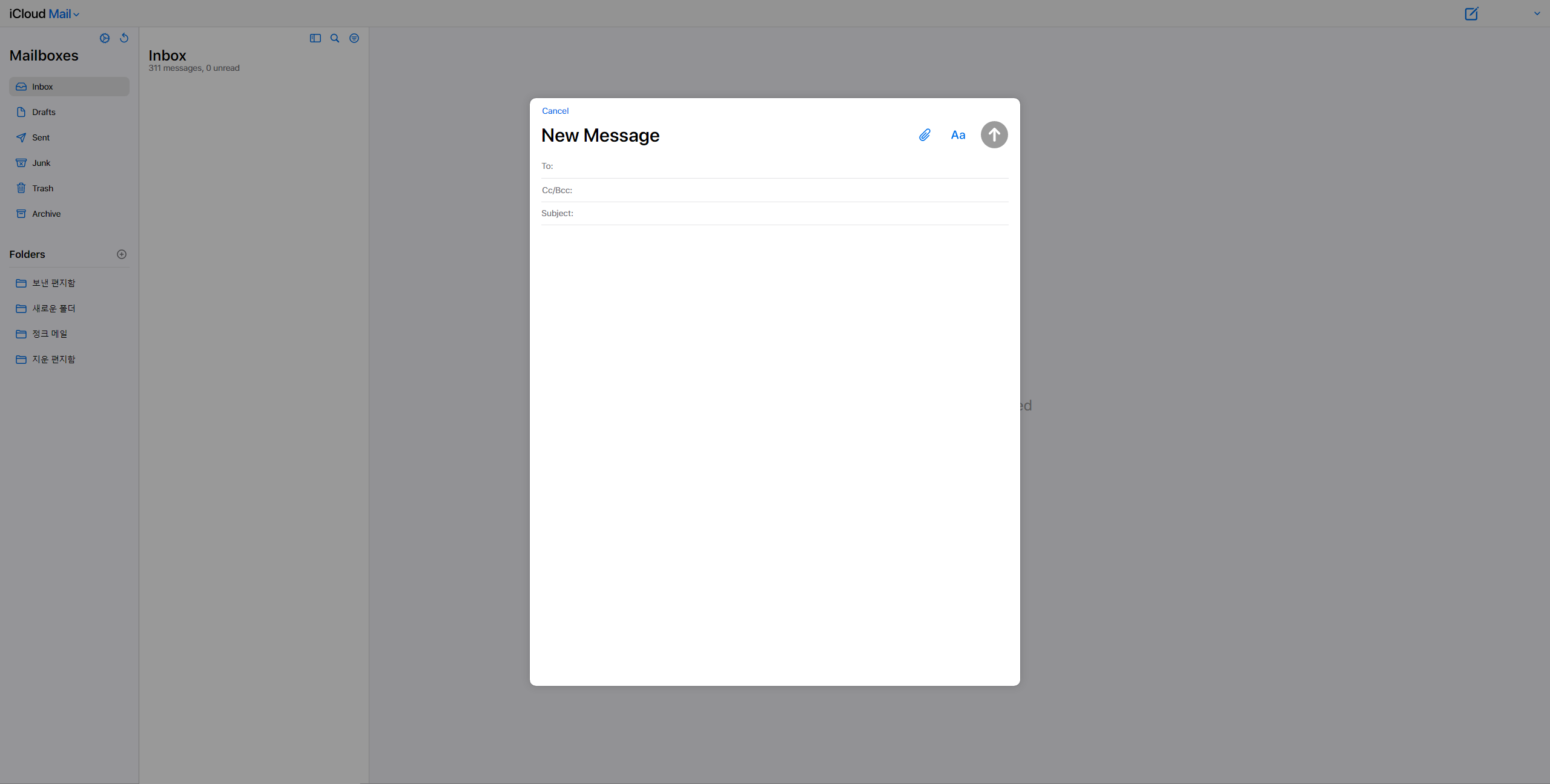 기존 iCloud Mail과 새 iCloud Mail은 기본 UI가 바뀔 뿐만 아니라 메일 작성 팝업도 변경되었습니다. 기존 iCloud Mail은 새로운 창에서 메일을 작성해야 했지만, 새로운 iCloud Mail은 동일한 창에서 팝업 되어 메일을 작성할 수 있습니다.