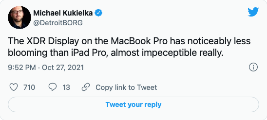 Brain Tong은 새로운 M1 Max 16형 MacBook Pro의 리뷰를 통해, mini LED 디스플레이에서 블루밍 현상이 없는 것은 아니지만, 짙은 검은색 배경에서 밝은 흰색 텍스트나 로고를 볼 때만 나타나며, 카메라로 촬영할 때 블루밍 효과가 과장되어 보이고 있기 때문에 육안으로 볼 때 블루밍 현상이 훨씬 보이지 않는다고 말했습니다. 이외에도 새로운 MacBook Pro를 사용하는 유저들은 iPad Pro 12.9형의 mini LED 디스플레이보다 MacBook Pro의 디스플레이에서 블루밍 현상이 거의 보이지 않는다고 밝혔습니다.