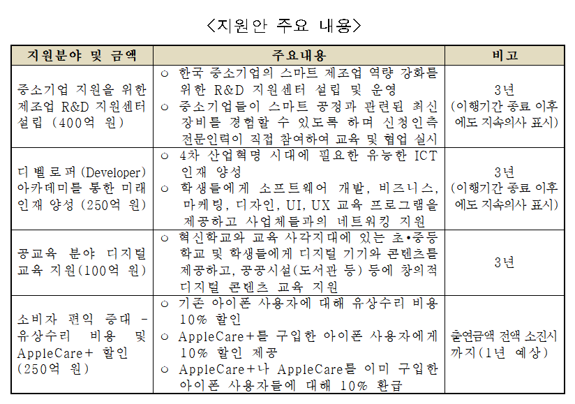 위 동의의결안에 따라 애플코리아는 공교육 분야 디지털 교육 지원을 해야 했으며, 마련한 1000억 원 중 100억 원 규모입니다. 나머지 중소기업 지원 및 제조업 R&D 지원 센터 설립(400억)과 Apple Developer Academy(250억)은 포스텍과 협력해 현재 지원자를 선발하고 있으며, iPhone 수리 비용 할인 및 Apple Care+ 할인(250억)도 현재 진행하고 있습니다.