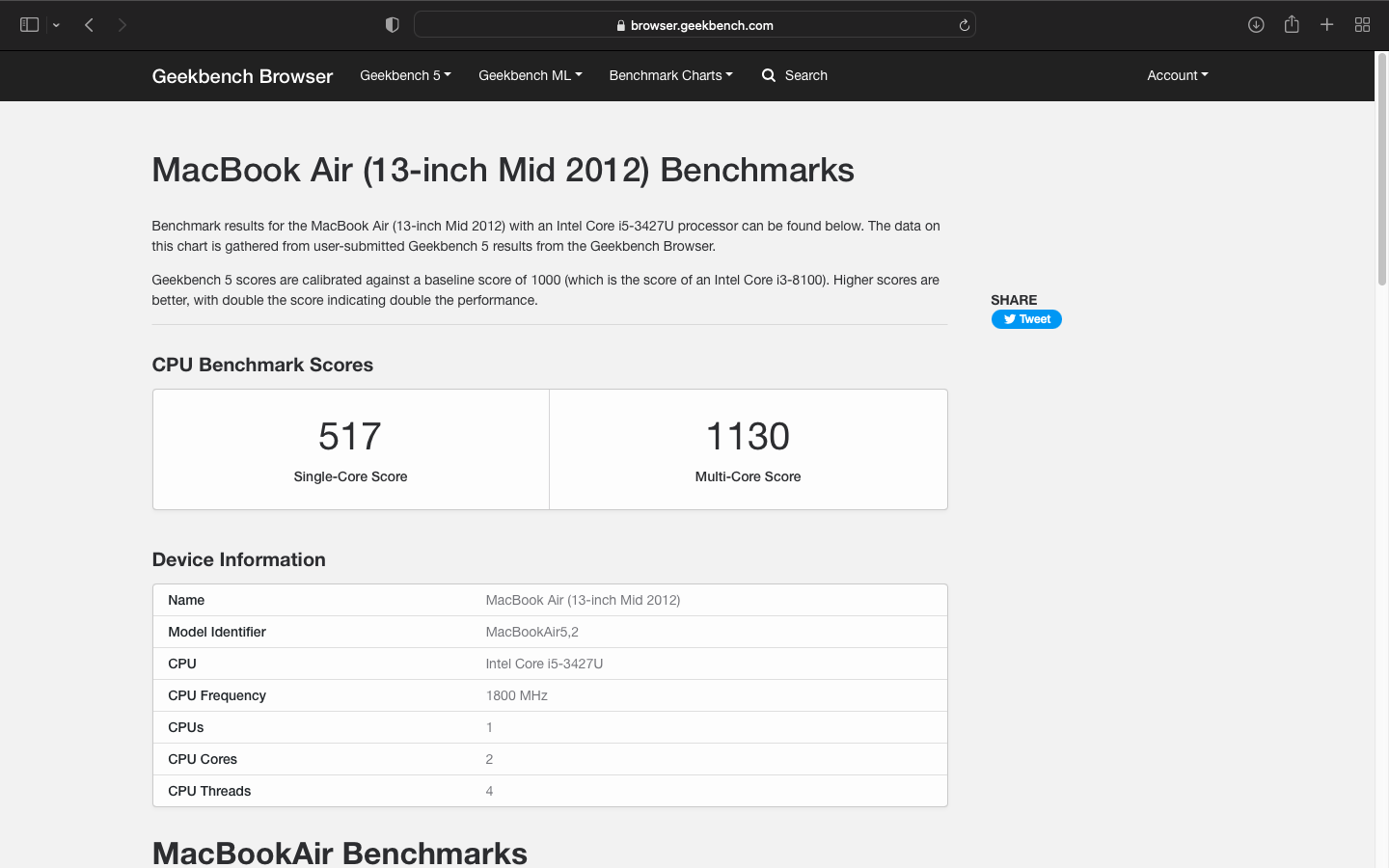 벤치마크 홈페이지기준 싱글 코어 517점 멀티 코어 1,130점의 점수를 보여줍니다.