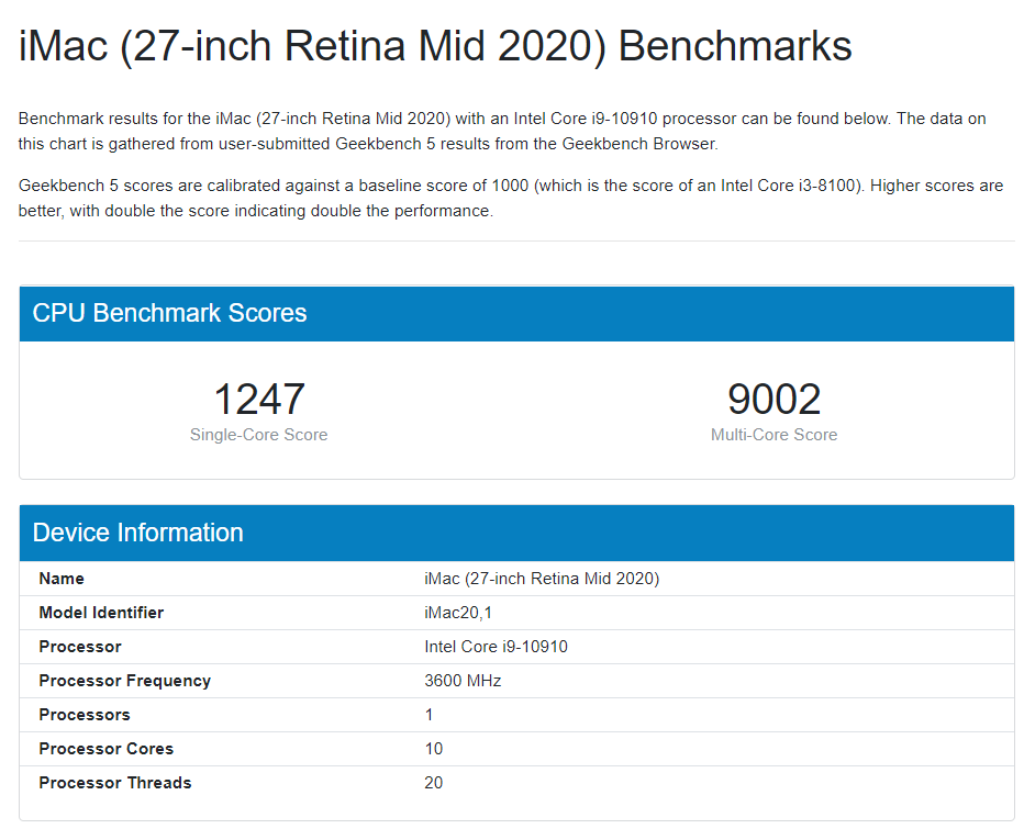 현재 판매 중인 27형 Intel i9-10900이 탑재된 최고급 옵션 iMac과 비교하면 싱글 코어 1,247점과 멀티 코어 9,002점을 기록했으며, M1 iMac이 싱글코어의 성능은 38% 더 좋지만 멀티코어 성능이 i9-10900 보다는 25% 뒤떨어지는 성능입니다.